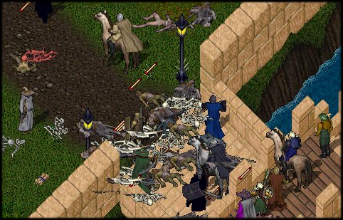 The Battle Opens. . . I bring fell news from the city of Honor. The defenses of the walled city were sorely tested this eve as Juo'nar once again renewed his assault. . . I had spent the night in Trinsic on my way to meditate at the Shrine of Honor to the South. Little did I know that I would awake this morning to the unmistakable, disgusting sound of clattering and grinding undead bones. A legion of skeletal knights had begun yet another assault on the fair city of Trinsic. I hastened from my bed roll and drew my sword. . . a silver katana of exceptional power. Quickly the alarm was raised and Virtuous warriors flooded the streets, driving the fell undead back. The area surrounding the bank in hand, I decided to inspect the interior of the city. What I discovered did not bode well for the town. Obviously, the walls had been breached at some point or some foul magic had succeeded in teleporting the enemy within our midst. . . for legions of skeletal mages, knights, and liches now swarmed in marauding bands throughout the city. Spotting a large band of the fiends, I attempted to gather a band of warriors to liberate the center of town. Together with such brave warriors as Wizrolf, Loren Soth, Cylex, and Chavrain, we fought from bridge to bridge, gradually reclaiming the city for Virtue. The center of town in hand, I decided to offer my eager help to those who would hold the southern (lesser) gate against the evil from without. As I traveled to the south, I came upon one named Farimir who had obviously fallen in honorable combat with the evil that threatened us. Just as he was recovering his belongings (having been revived by a healer), another wave of fiends came clamoring up the road from the South gate. I and two companions attempted to form a line of battle and protect Farimir as he attempted to recover from his journey in the netherworld. We were barely successful as Farimir eventually joined the battle which ended in victory. Our other companions having departed, Farimir and I decided to reclaim the Southern gate. A long battle ensued but we managed to force the forces of darkness through the gate and out onto the beach to the south. Making our way around the wall, we fought our way across the open fields and the mesas to the West of Trinsic. At that point, in the clamor of battle, I lost track of Farimir and I am sorry to say that I did not see him again in death or life that eve. However, as I crossed the bridges leading north towards the main gate, expecting to see evidence of our expected victory, I was met by a haggard and war-worn woman named Crystal who brought terrible news of our losses at the main gate. Jabbing my heals into mine horses sides, I lept at once to full gallop as I determined to give all I could to help turn the tide, however meager my powers of combat. . . I arrived to find total carnage. The gate had been forced. Liches, all types of skeletons, and mummies roamed the streets of the once fair city, slaying at will. A valiant band of warriors could be seen making a stand at the main intersection down the street from the gate. Gradually, the valor of this band began to tell on the forces of evil as they gradually began to be forced back through the gate and out into the wilderness.