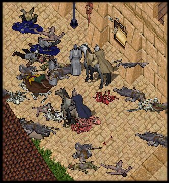 With those words I too dove into the melee. Juo'nar was staggered several times and our blows finally began to tell on him. Finally, he retreated along with his army. Celebrations broke out as the last of the invaders were swept aside. However, just as a calm began to settle over the town, the bells of alarm again began to sound at the main gate. We had not in fact seen the end of the battle. . . The contest outside the gates became more fierce then than it had ever been before. In ever increasing numbers the army of darkness assailed the walls. The gate was lost, retaken, and lost again several times over. Juo'nar would give battle ever and anon, but always fleeing should his pitiful semblance of true life ever be in any type of jeopardy. At one time I felt his full power as with just one casting I was reduced to no more than a semblance of my former strength. At that point, a mongbat could have snuffed out what life was left within me. Fortunately, the Virtues protected me and I was able to retreat for a brief period and tend to my grievous injuries. For almost four hours the battle raged. Finally, when even the bravest and stoutest of us had been sent to the healers several times, when even those whom I had fought alongside all this long eve began to talk of retreat and the safety of Britain, when all hope seemed lost. . . we saw that the last of the evil army approached and the Virtues smiled upon us. . . for though their numbers were vast beyond our reckoning, this last reserve of the enemy was nothing but skeletons, neither knights nor magi. With hope renewed and victory in sight, we brandished our swords once more and clove a path through their ranks, eventually hewing the last of them only minutes after this last sortie began.